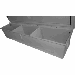 Clean up that deck! Our very own 7′ storage bench design is perfect for any pool deck. Store your swimming fins, pool floats, kickboards or just about anything you need to remove from your poolside. Constructed of one piece solid reinforced fiberglass with two inside dividers molded to the bench, and a white gel coat exterior and painted interior for a lasting attractive appearance. Strong enough to use as extra seating. Stainless steel lockable clasp for security. 4 rubber feet and bottom drain holes allow water to exit.